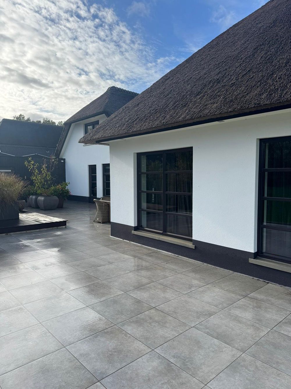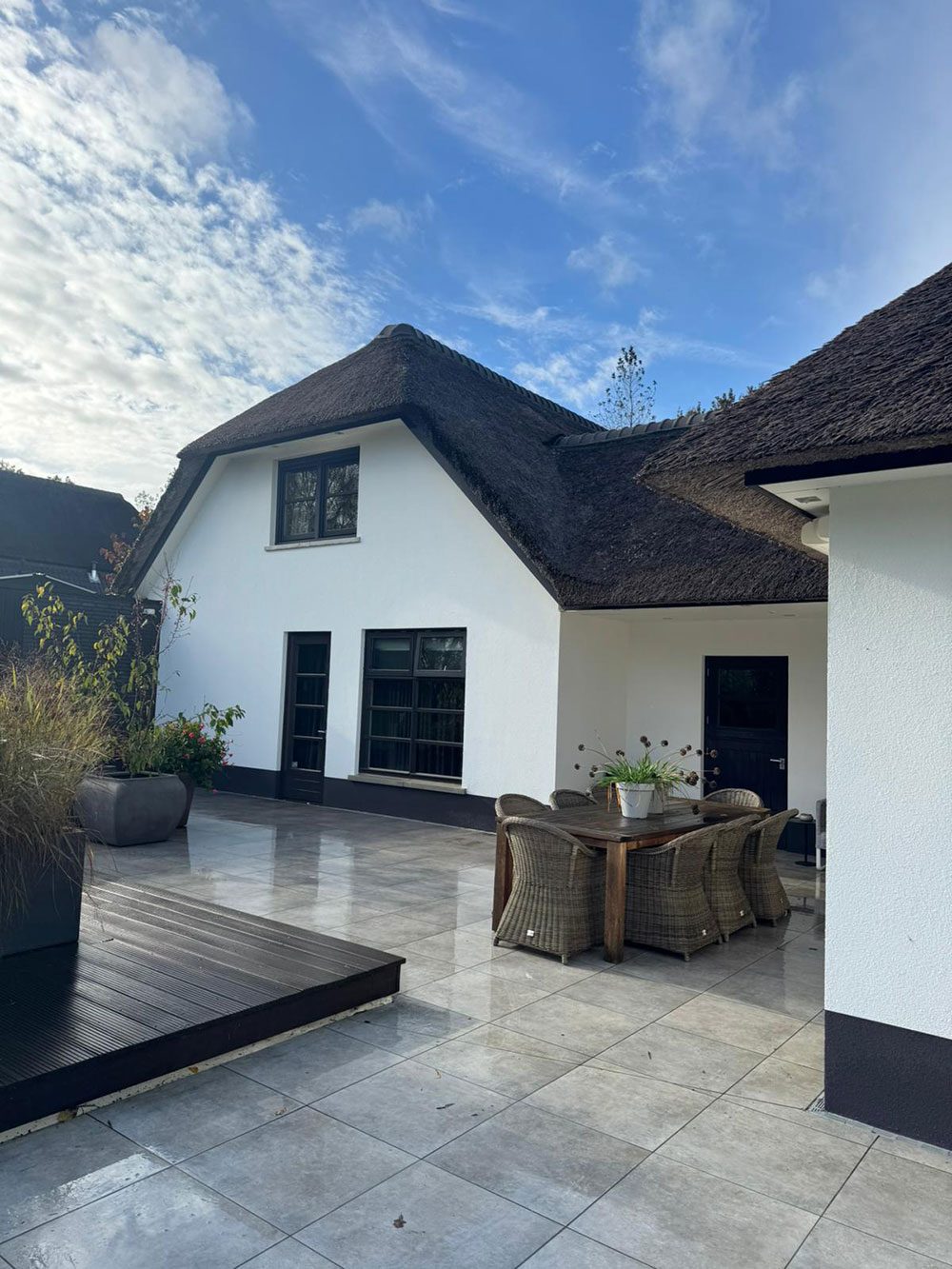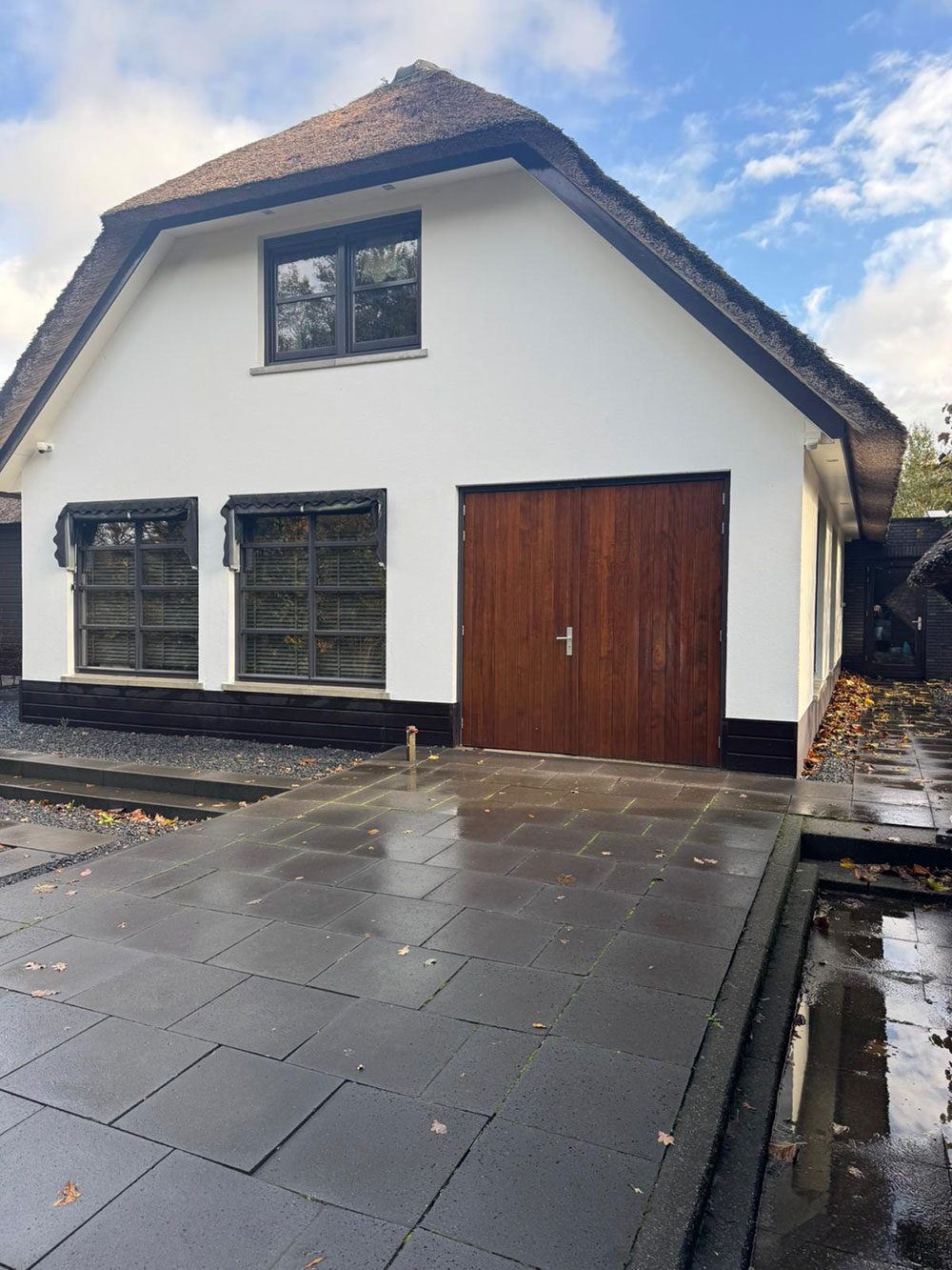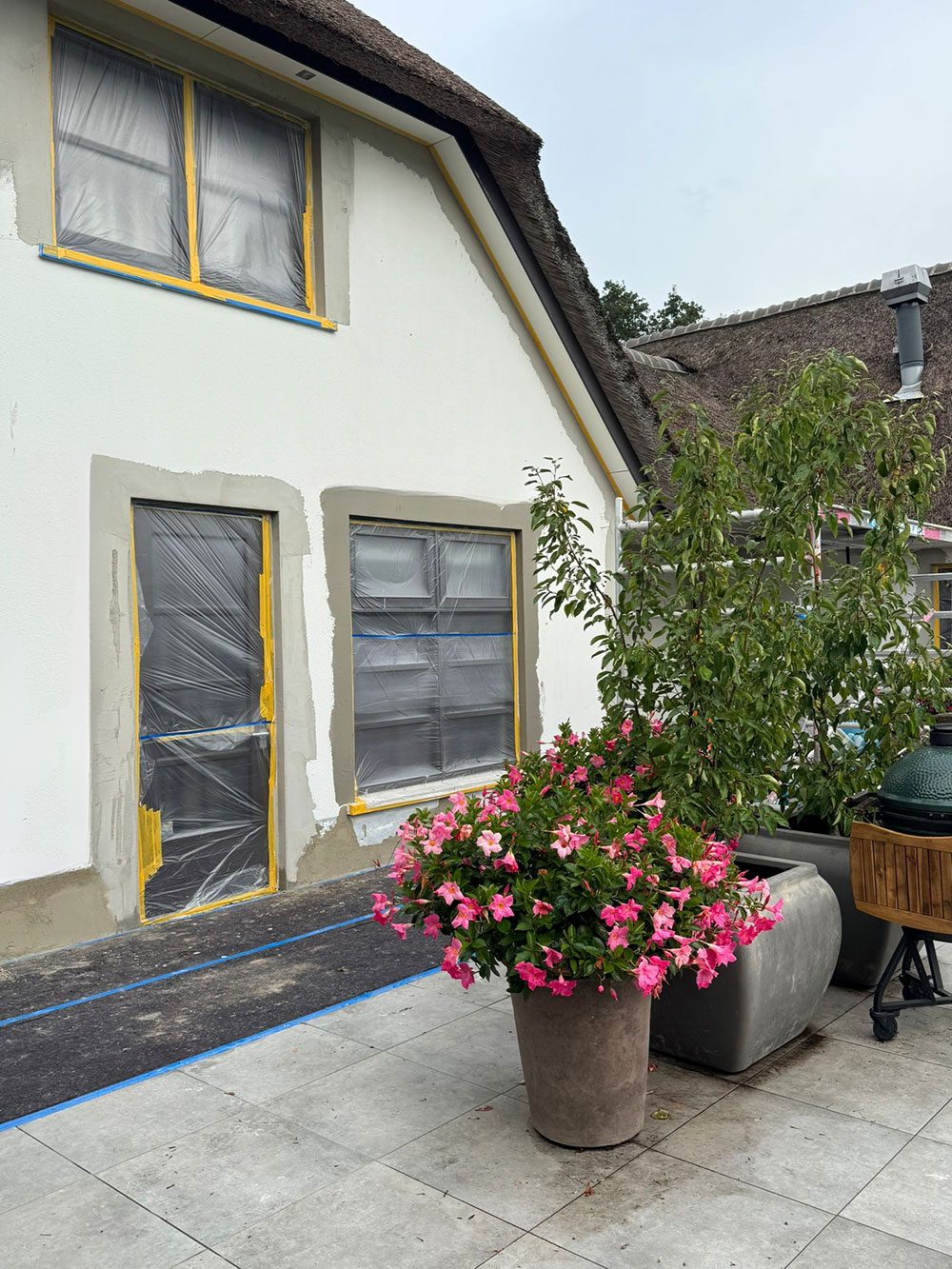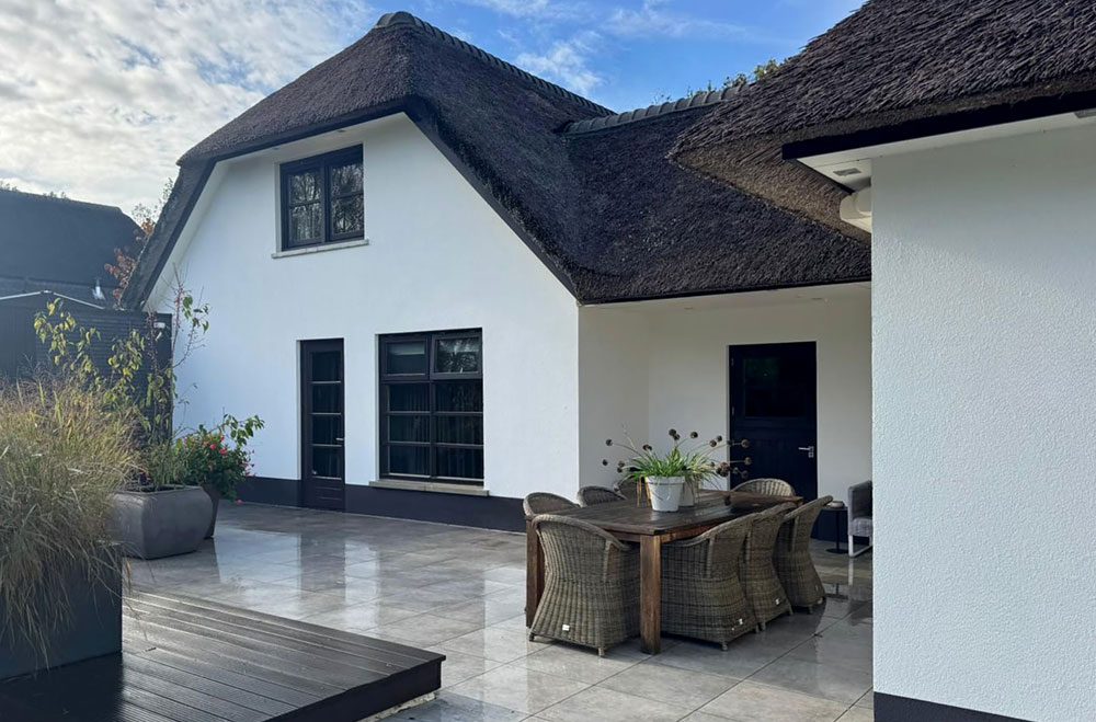 Voor deze prachtige woning in Zieuwent mochten wij de gevels volledig renoveren. De gevels zijn eerst zorgvuldig gereinigd, waarna we de plint hebben hersteld waar dat nodig was. Vervolgens hebben we een tweelaags mortel- en weefsellaagsysteem aangebracht en de gevels opnieuw gestuct voor een strak en duurzaam resultaat. Als finishing zijn de gevels dekkend gesausd met een vuil en algenwerende coating, zodat de woning er niet alleen prachtig uitziet, maar ook langdurig beschermd is tegen weersinvloeden.